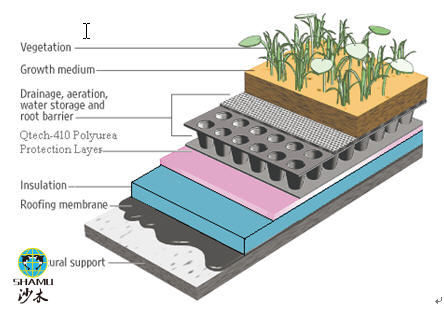This project from polyurea formulation, construction design to installing is created by Qingdao Shamu International Trade CO., LTD. This vegetated roofing is used as an outdoor natural exposure testing field.